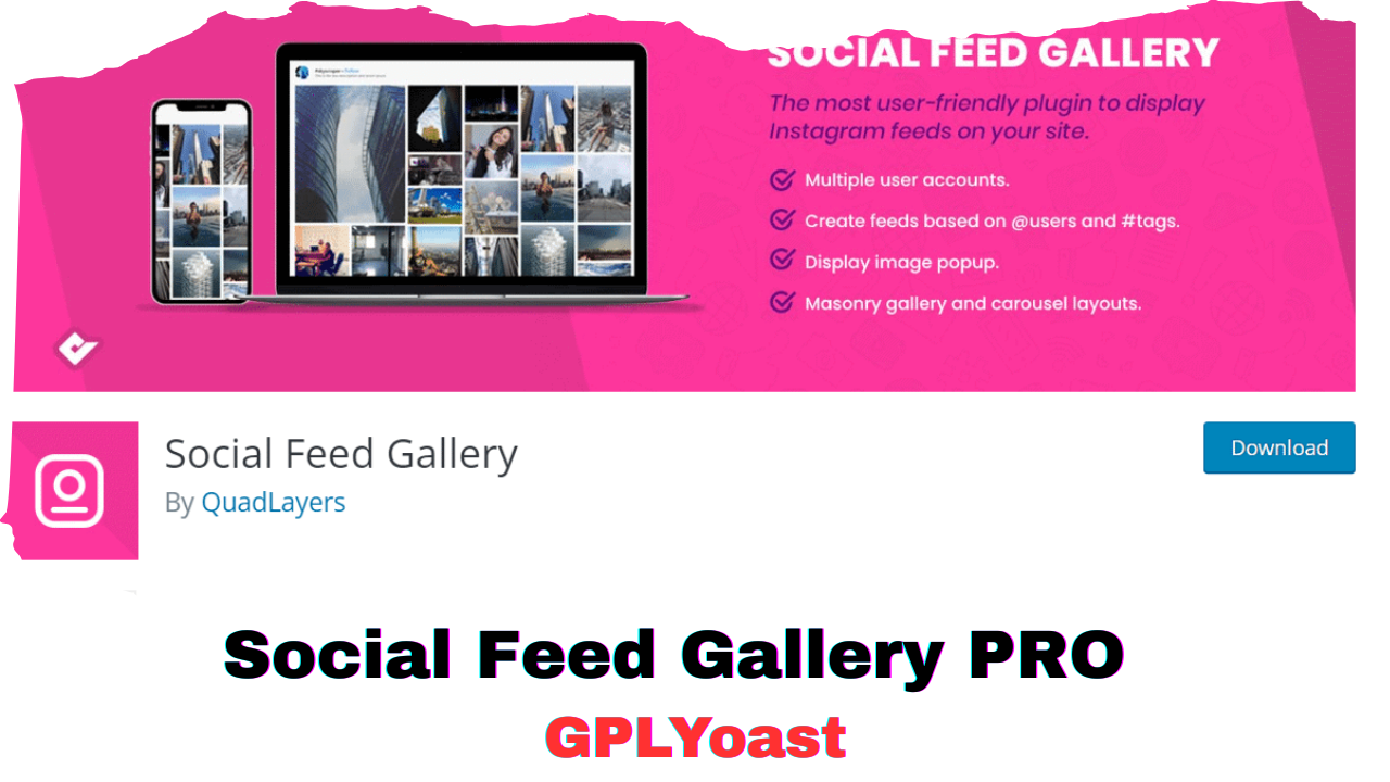 Social Feed Gallery PRO is a powerful WordPress plugin developed by QuadLayers that enables you to showcase Instagram photos and videos on your website. This plugin is designed to engage your audience, boost conversions, and enhance your social proof by integrating your Instagram feed seamlessly into your WordPress site. By displaying your exciting Instagram content directly on your website, you can promote your social media presence, gain more followers, and strengthen customer trust. Social Feed Gallery PRO is ideal for those looking to enhance their website’s visual appeal, increase user engagement, and leverage their social media content for business growth.